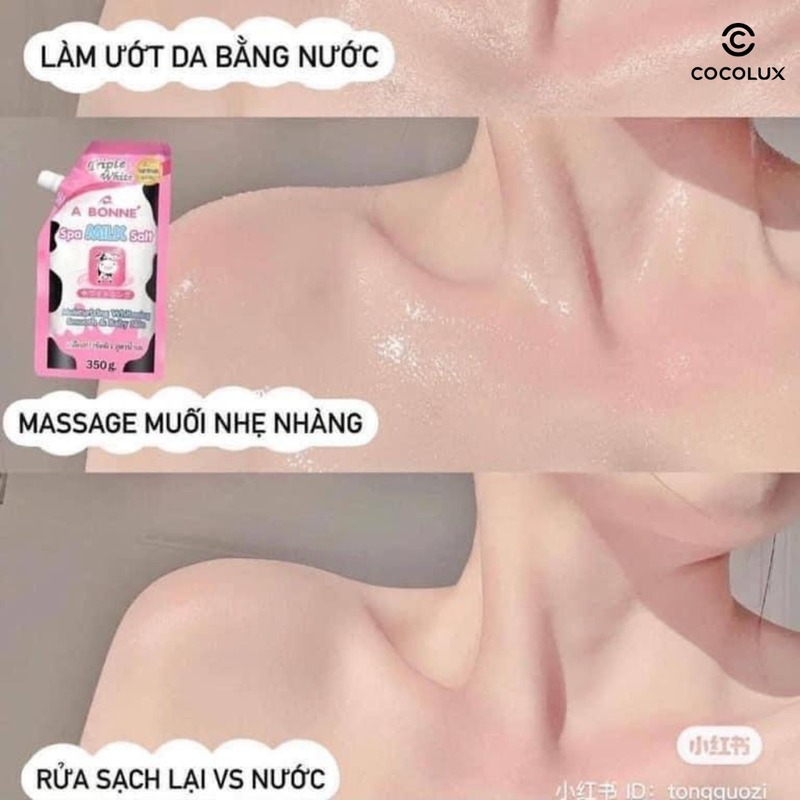 Muối tắm trắng da sữa bò Spa A Bonne Thái Lan 350g là sản phẩm đến từ thương hiệu A Bonne. Sản phẩm chứa các thành phần như vitamin C, tinh chất sữa bò, sữa chua… tác động trực tiếp vào làn da để cấp ẩm, hỗ trợ điều trị mụn lưng, vết thâm cho bạn làn da trắng mịn rạng ngời. Kết cấu dạng muối siêu mịn và thơm mùi sữa khi massage lên da vô cùng êm mái, tạo cảm giác thư giãn và nhẹ nhàng làm sạch tế bào chết, bụi bẩn, vi khuẩn, đồng thời dưỡng da mềm mịn, giảm thiểu tình trạng kích ứng.