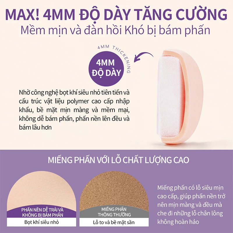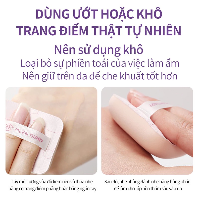 Phù hợp với kem nền, cushion, kem che khuyết điểm và phấn nước, mút Mlen Diary giúp tạo nên lớp nền mỏng nhẹ, trong suốt mà vẫn che phủ tốt - cho làn da rạng rỡ suốt ngày dài.