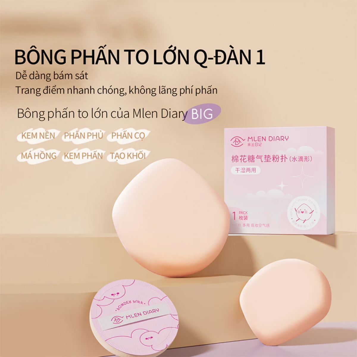 Mút Tán Nền Mlen Diary là công cụ không thể thiếu trong túi makeup của mọi cô gái. Với thiết kế mềm mịn, đàn hồi tốt và khả năng ăn phấn vừa đủ, mút giúp tán nền mịn mượt, tự nhiên, không để lại vệt hay mốc phấn.