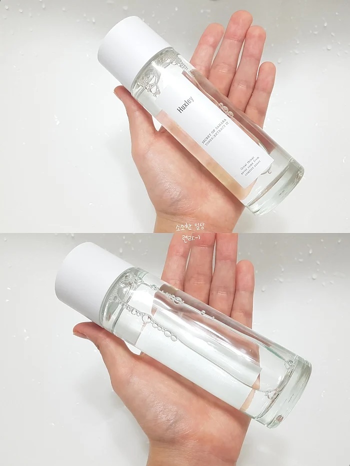 Huxley Toner; Extract It có kết cấu dạng lỏng, trong suốt, trơn và hơi dính, có khả năng thẩm thấu nhanh vào da. Khi apply, da sẽ nhanh chóng cảm nhận được sự dịu mát và độ ẩm mà sản phẩm đem lại, không gây nhờn dính, không làm bít tắc lỗ chân lông. Toner Huxley là nước hoa hồng có độ pH 5.5 mang tính axit nhẹ, trùng với độ pH trên làn da của trẻ sơ sinh, do đó, sản phẩm không gây kích ứng và làm khô da, ngược lại, còn giúp cân bằng độ pH trên da.