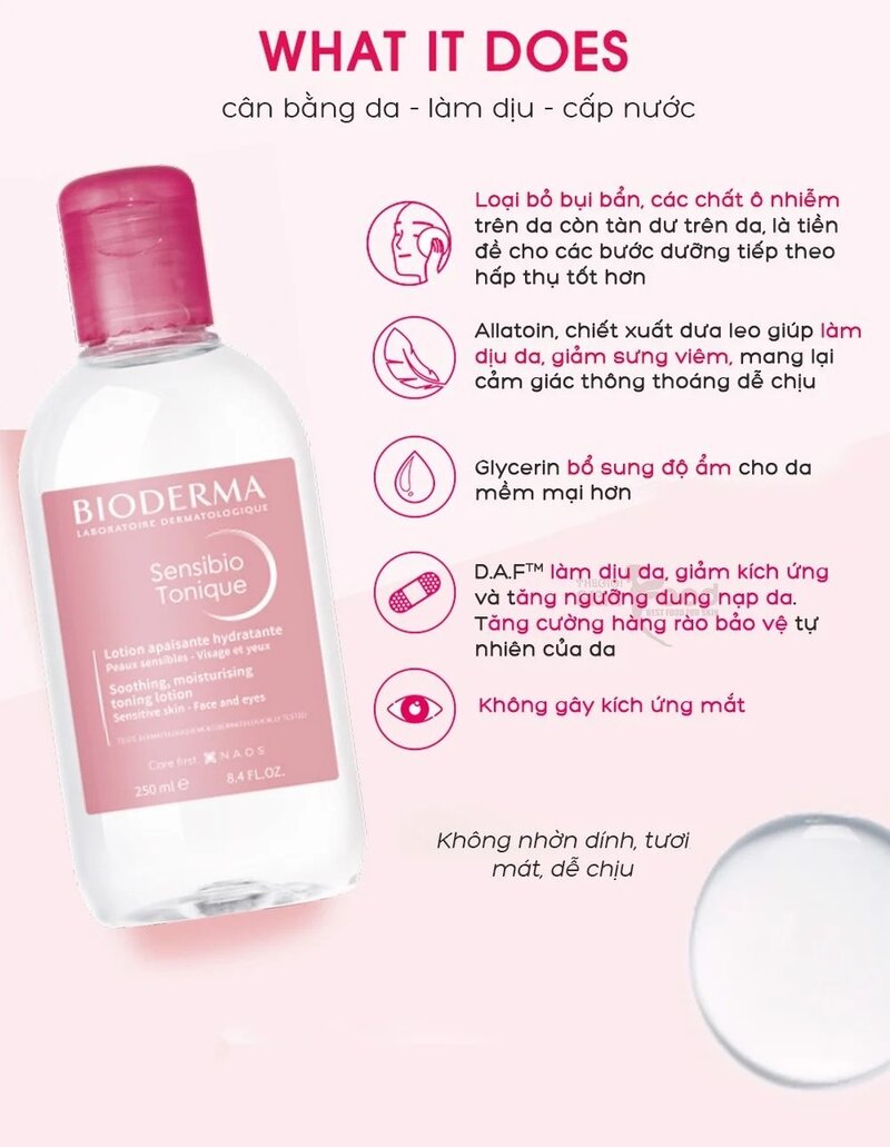 Đặc biệt, sản phẩm chứa thành phần hợp chất D.A.F. độc quyền của Bioderma giúp làm dịu da, giảm kích ứng, tăng khả năng hấp thụ dưỡng chất, tăng sức đề kháng cho da săn chắc, khỏe mạnh. Toner có kết cấu dạng lỏng, có khả năng thẩm thấu nhanh vào da, không gây nhờn dính hay làm bít tắc lỗ chân lông. Khi apply, da nhanh chóng cảm nhận được sự tươi mát, dễ chịu, cho hiệu quả dưỡng ẩm lên đến 8 giờ. Sản phẩm chứa các thành phần lành tính, an toàn cho da, vì thế, thích hợp sử dụng cho da nhạy cảm.
