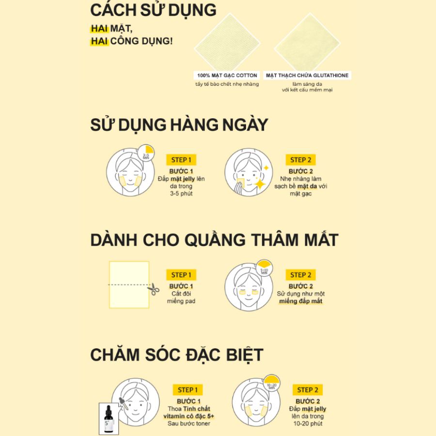 Với thiết kế hai mặt độc đáo, mặt gạc giúp làm sạch sâu và loại bỏ bụi bẩn, trong khi mặt thạch mịn giúp dưỡng sáng nhẹ nhàng. Sản phẩm này phù hợp cho mọi loại da, đặc biệt là da kém mịn màng, không đều màu và cả da nhạy cảm. Numbuzin Vitamin Niacinamide Concentrated Pad No.5 đã được thử nghiệm và nghiên cứu bởi Trung tâm Nghiên cứu Da liễu, đảm bảo an toàn và hiệu quả cho người sử dụng, là sự lựa chọn tuyệt vời để bổ sung vào quy trình chăm sóc da hàng ngày của bạn.
