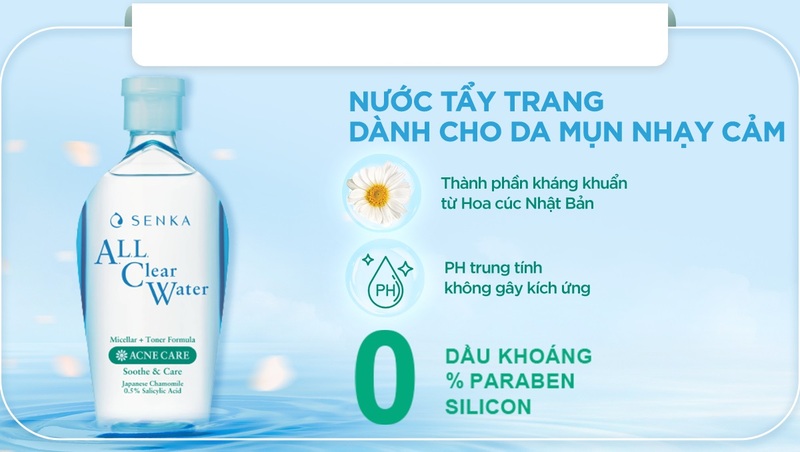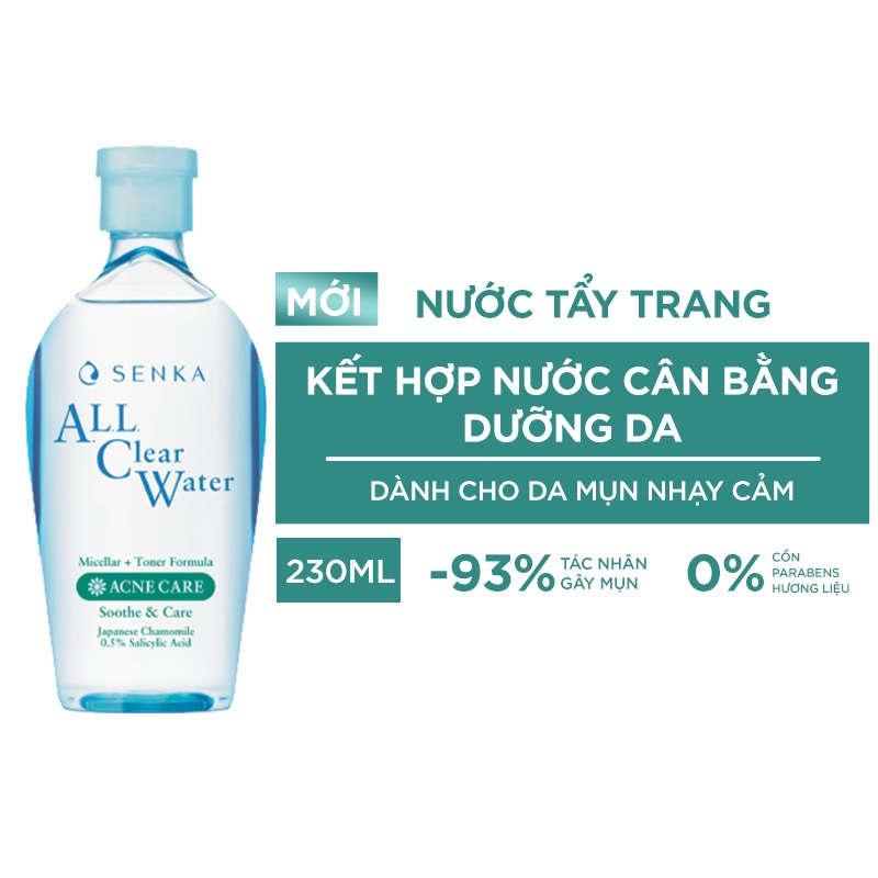 Nước Tẩy Trang Senka All Clear Water Acne Care Ngừa Mụn 230ml nổi bật với công thức chứa các thành phần dưỡng da độc đáo. Trong đó, chiết xuất hoa cúc Nhật Bản có khả năng kháng khuẩn, chống oxy hóa, giảm mụn trên da. Salicylic Acid nồng độ 0.5% giúp làm sạch và thanh lọc làn da, kháng viêm, giảm kích ứng, làm giảm và ngăn ngừa mụn xuất hiện trên da.