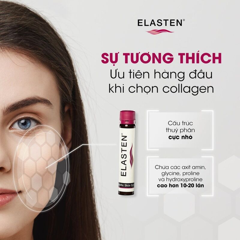 Elasten sử dụng Collagen từ bò, là loại Collagen có độ tương thích tới 90% cấu trúc Collagen tự nhiên của con người, giúp bổ sung lượng Collagen thiếu hụt cho cơ thể, đồng thời, giúp da được săn chắc, trẻ hóa, sức khỏe tóc và móng được cải thiện rõ rệt.