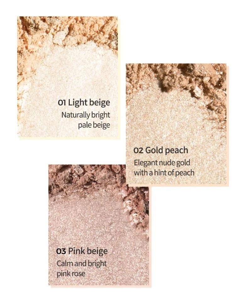 Too Cool For School Artclass By Rodin Highlighter #2 Luminous gồm 3 màu: hồng nude, hồng đào sáng, hồng Champagne. Ánh sáng pha lê màu hồng hòa quyện cùng màu da mà không gây vón cục hay làm khô da, cho làn da ửng hồng khỏe mạnh tự nhiên. Sản phẩm đem đến lớp trang điểm ửng hồng với ánh sáng satin kết hợp mượt mà với màu da bạn.
