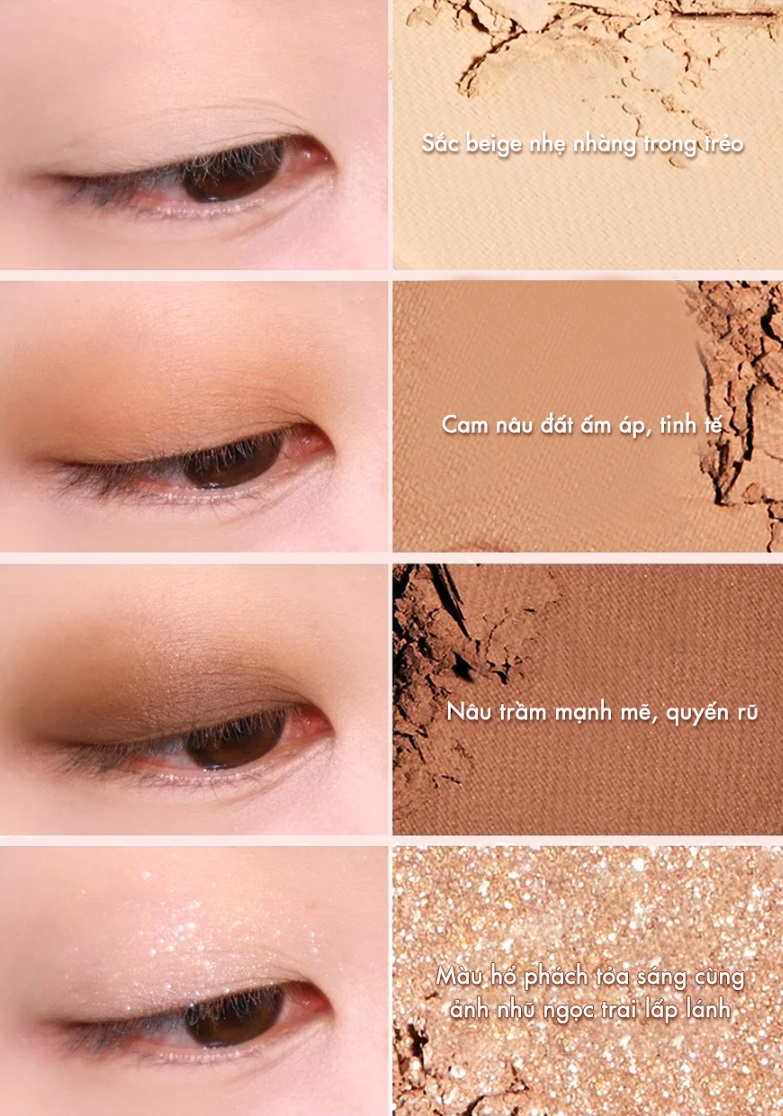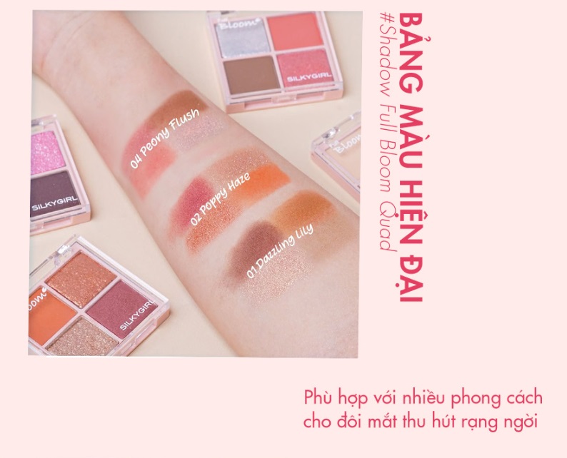 Hiện tại, Phấn mắt 4 ô Silkygirl Bloom Shadow Quad đang có mặt tại Cocolux với 3 bảng màu như sau: