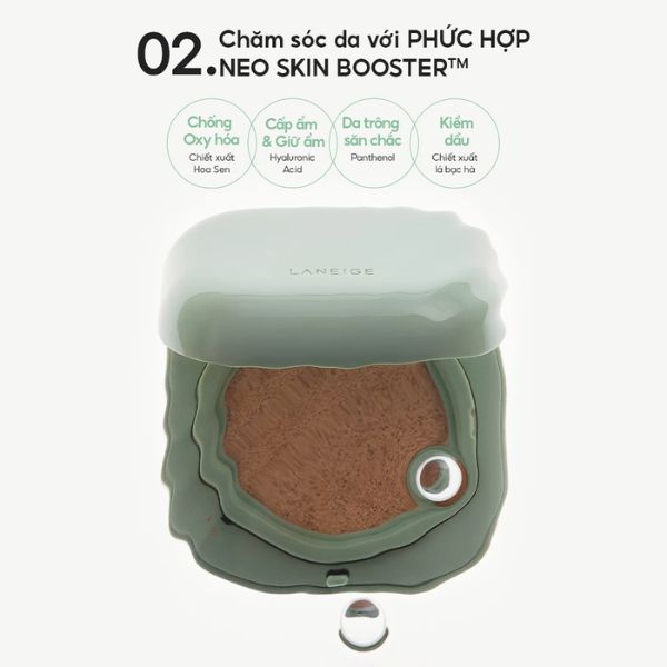 Thêm vào đó, Phấn Nước Che Khuyết Điểm Laneige Neo Cushion SPF 46 PA++ còn sử dụng công thức chứa nhiều thành phần chăm sóc da, đem đến làn da sáng rạng rỡ, tự nhiên. Phức hợp NEO SKIN BOOSTER™ giúp chống oxy hóa, dưỡng ẩm, kiềm dầu, dưỡng da săn chắc và rạng rỡ.