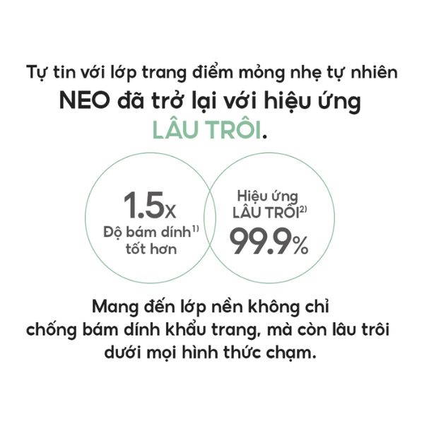 Sản phẩm sử dụng công nghệ hòa quyện của NEO, tạo ra những hạt phấn có kích thước chỉ 0.17µm, tạo lớp nền mỏng nhẹ, dễ chịu. Laneige Neo Cushion có khả năng che phủ tốt, giúp làn da trở nên mịn màng, đều màu mà không gây cảm giác nặng mặt.