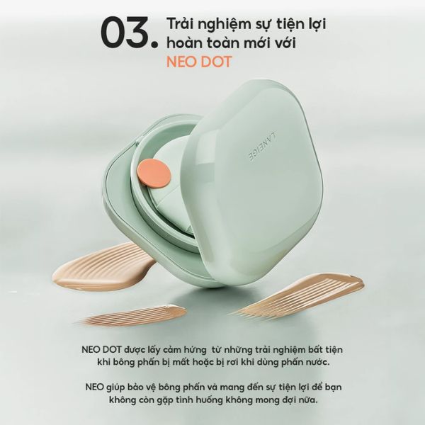 Thiết kế hộp cushion NEO DOT giúp bảo vệ bông phấn, tránh tình trạng bông phấn bị mất hoặc rơi khi dùng phấn nước. Bông phấn có kết cấu đặc, chứa các khe hở được thiết kế đóng mở liên tục khi dặm bông phấn, giúp tạo lớp nền mỏng nhẹ, có độ che phủ cao. Bông phấn được làm từ chất liệu có nguồn gốc thực vật, tạo cảm giác mềm mại, dễ chịu trong quá trình sử dụng.