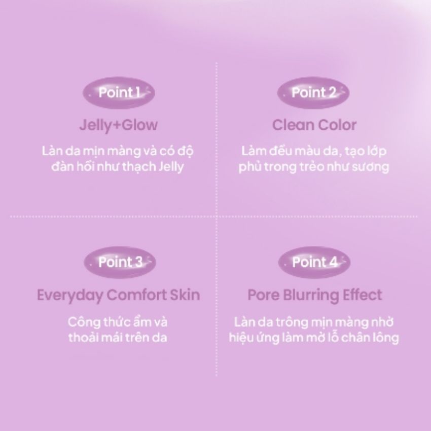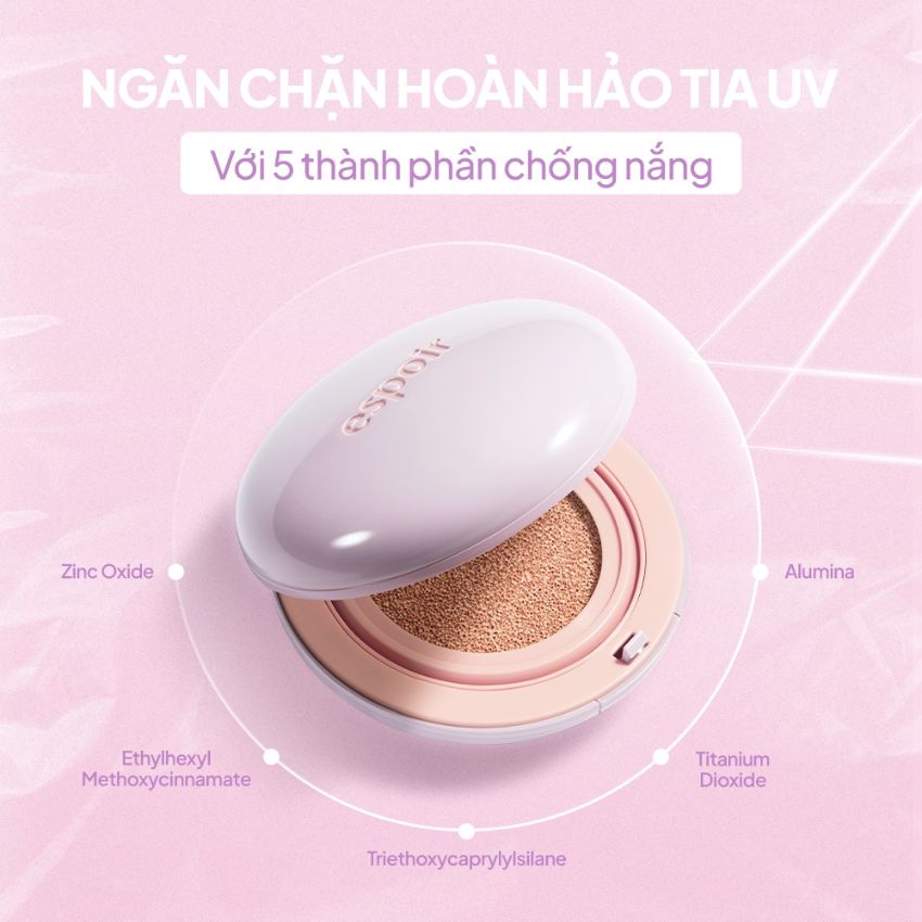 Với công nghệ hạt phấn hình cầu siêu nhỏ, Espoir Dewlike Jello Tone Up Cushion giúp lấp đầy và làm mờ lỗ chân lông, đồng thời tạo ra một lớp phản chiếu ánh sáng tự nhiên, giúp làn da trông glowy và mịn màng hơn. Chỉ số chống nắng SPF50+ PA+++ còn bảo vệ da khỏi tác hại của tia UVA/UVB, các yếu tố gây tổn thương khác như nhiệt độ, ánh sáng xanh, giữ cho làn da bạn luôn được bảo vệ và khỏe mạnh