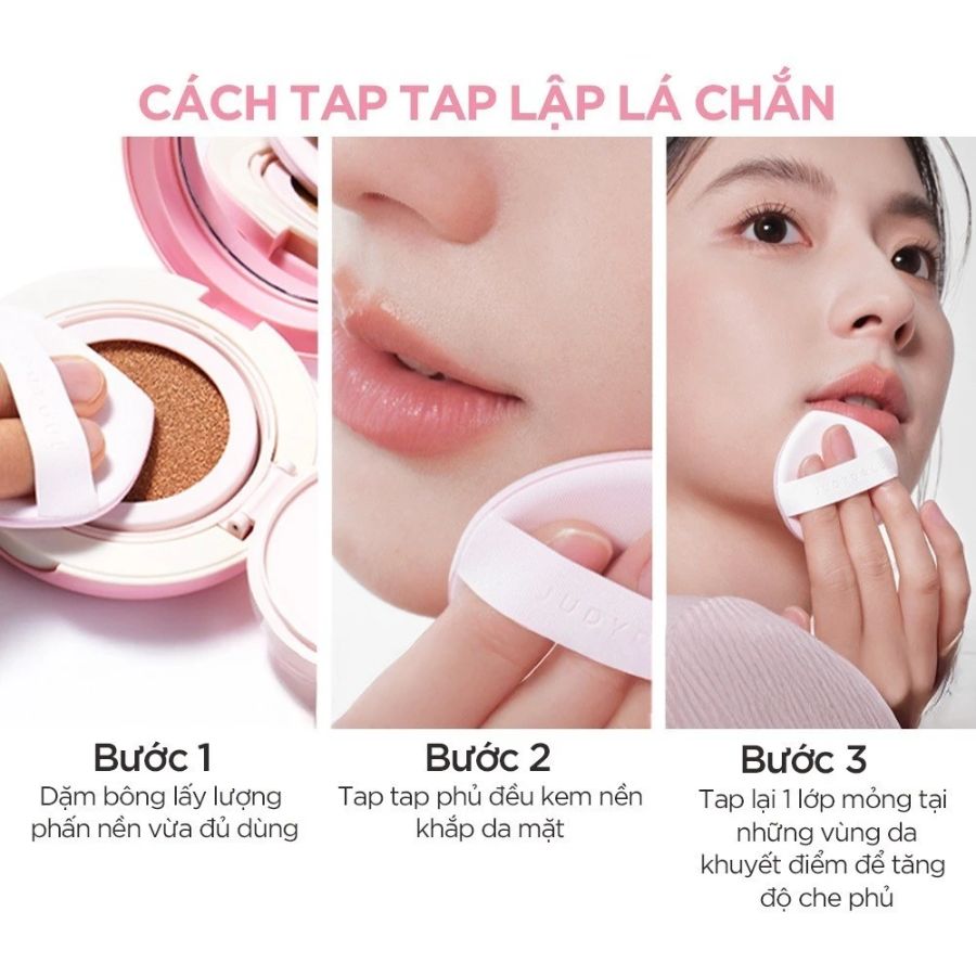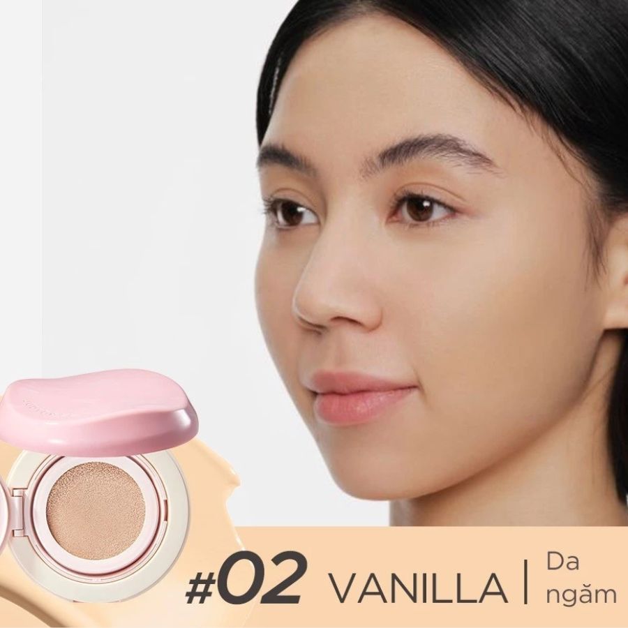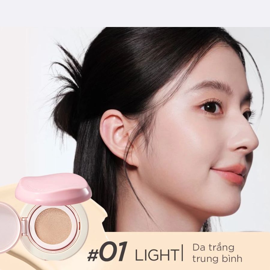 Không chỉ giúp nâng tông và làm đẹp da, cushion này còn tích hợp khả năng chống nắng vượt trội SPF 50+ PA+++, kết hợp cùng 8 tinh chất làm dịu như rau má, trà xanh và cúc La Mã, an toàn cho cả làn da nhạy cảm. Thiết kế bông mút hình giọt nước thông minh giúp dễ dàng tán nền đều ở những vùng khó như quanh mũi hay dưới mắt, cho lớp nền tự nhiên, bền màu và lâu trôi.