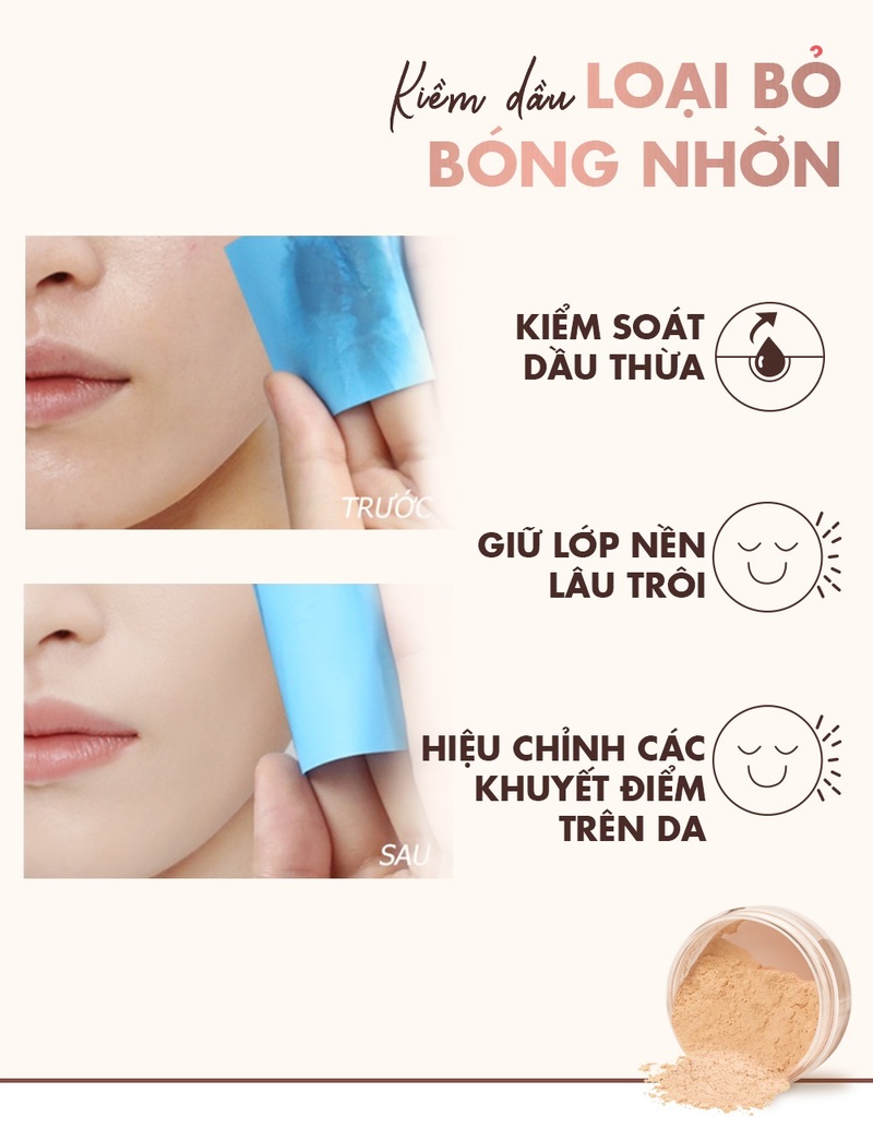 Shine Free Silkygirl với công thức hạt phấn có khả năng kiểm soát dầu thừa ưu việt, giúp hút dầu thừa, bã nhờn trên da, cho da khô thoáng, thoải mái. Phấn phủ bột có màu Shine free silkygirl chứa các thành phần lành tính, giàu dưỡng chất, an toàn cho da nên còn giúp dưỡng ẩm, dưỡng da, đem đến làn da mịn màng, căng bóng, bảo vệ da khỏi các tác nhân gây hại bên ngoài môi trường.