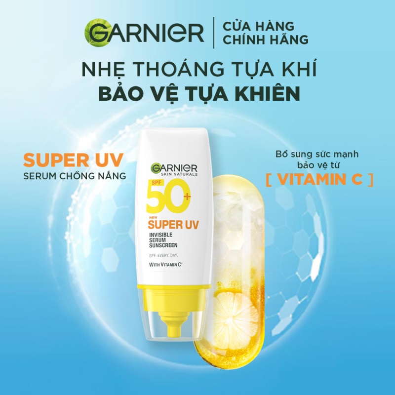 Serum Chống Nắng Garnier Skin Naturals Super UV Invisible Serum Sunscreen 30ml nổi bật với công nghệ Air-Lock độc quyền, giúp mang đến kết cấu mỏng nhẹ, cho lớp chống nắng trên da tự nhiên, không làm bít tắc lỗ chân lông.
