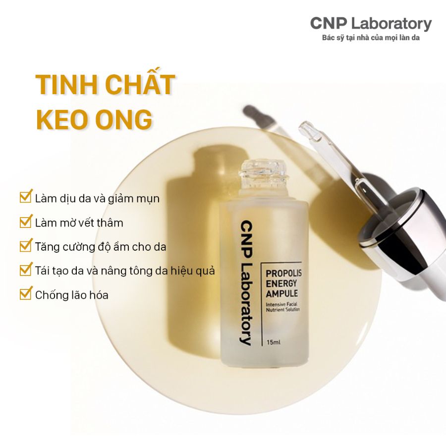 Serum CNP Laboratory keo ong tái tạo phục hồi da nổi bật với chiết xuất keo ong đậm đặc, có khả năng chống oxy hóa, phục hồi và nuôi dưỡng da, kết hợp với Hyaluronic Acid giúp cấp ẩm sâu, duy trì làn da săn chắc và mềm mại. Ngoài ra, các thành phần như Madecassoside (rau má), Beta-glucan và peptide hỗ trợ làm dịu kích ứng, tái tạo da, giảm nếp nhăn, mang lại làn da khỏe mạnh, rạng rỡ.
