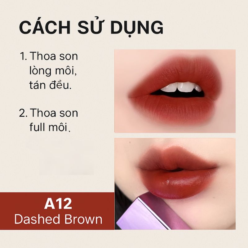 Trong đó, A12 Dashed Brown với sắc đỏ nâu trầm ấm thuộc version Mood Filter (Ver 2) là một trong những màu bán chạy nhất. Dễ dùng, tôn da và phù hợp với nhiều phong cách trang điểm, A12 là lựa chọn hoàn hảo cho mọi cô gái yêu thích vẻ đẹp vừa hiện đại vừa cuốn hút. Đặc biệt trong tháng 5 này, khách hàng mới có cơ hội sở hữu A12 với giá ưu đãi chỉ 139K, nhanh tay đặt hàng để không bỏ lỡ!