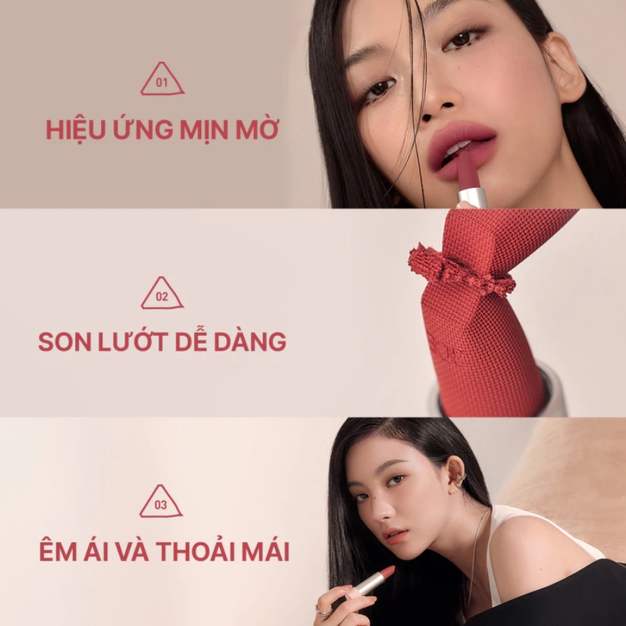 Son Thỏi 3CE Cashmere Hug Lipstick là dòng son thỏi lì cao cấp mới nhất từ thương hiệu 3CE. Đây là sản phẩm son môi được đánh giá cao bởi sự tinh tế trong thiết kế, cùng với chất son mượt mà và lâu trôi. Sản phẩm không chỉ giúp tạo màu sắc tươi tắn cho đôi môi, mà còn giữ cho môi luôn mềm mại, không bị khô hay lộ vân môi. Đặc biệt, bảng màu của 3CE Cashmere Hug Lipstick vô cùng đa dạng, từ những tông màu nude nhẹ nhàng, dịu dàng cho đến các sắc đỏ, hồng tươi tắn, phù hợp với mọi sở thích và phong cách.