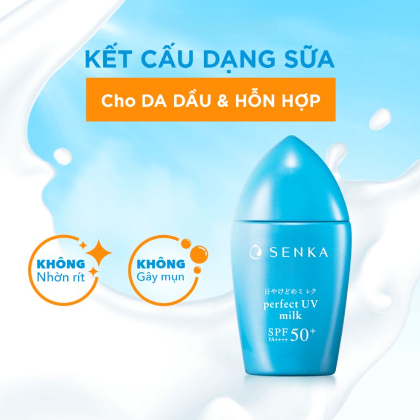 Thiết kế cho da dầu và da hỗn hợp, Senka Perfect UV Milk có kết cấu sữa mỏng nhẹ, thẩm thấu nhanh mà không nhờn rít. Sản phẩm chứa 50% tinh chất dưỡng da từ Nhật Bản như kén tơ tằm trắng và 2X HA, giúp dưỡng ẩm, ngăn ngừa nếp nhăn, làm sáng da.