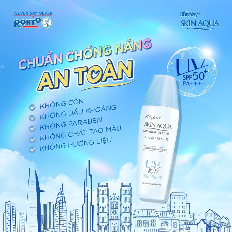 Với khả năng chống nắng lên tới 12h, sữa chống nắng vật lý Skin Aqua giúp tăng cường khả năng bảo vệ da khỏi các tác động xấu từ môi trường, giảm nguy cơ kích ứng và nổi mụn đối với làn da dầu nhạy cảm.