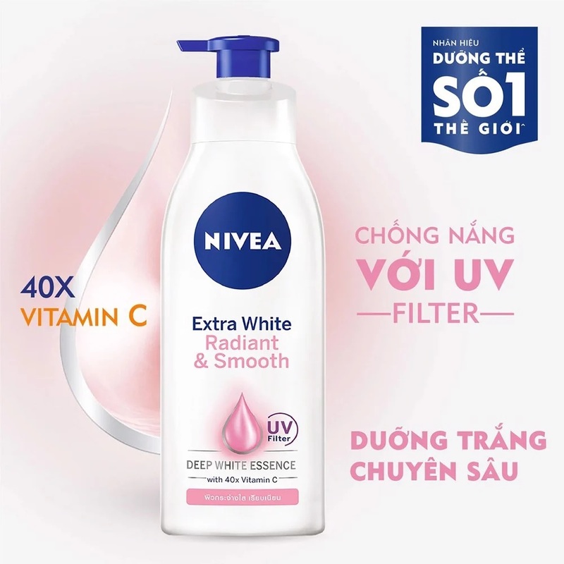 Không chỉ da mặt mà làn da body cũng rất cần được quan tâm, chăm sóc. Để da luôn mướt mịn, căng bóng, khỏe đẹp thì sữa dưỡng thể là một sản phẩm dưỡng da không thể thiếu. Sữa Dưỡng Thể Nivea Dưỡng Da Trắng Mịn với công thức chứa Vitamin C 40X giúp dưỡng trắng da chuyên sâu.