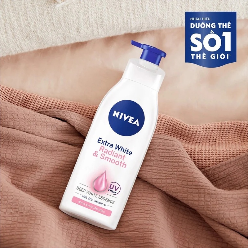 Nivea Extra White Radiant & Smooth Body Lotion có kết cấu dạng sữa, thẩm thấu nhanh vào da, không gây bết dính, không làm bít tắc lỗ chân lông. Với lượng Vitamin C gấp 40 lần, sản phẩm giúp nuôi dưỡng làn da trắng sáng, rạng rỡ nhanh chóng. Sữa Dưỡng Thể Nivea chứa các thành phần lành tính, an toàn cho da, không gây kích ứng, phù hợp với mọi làn da, đặc biệt là da đang bị xỉn màu, thâm sạm, da thiếu nước, khô ráp, sần sùi.