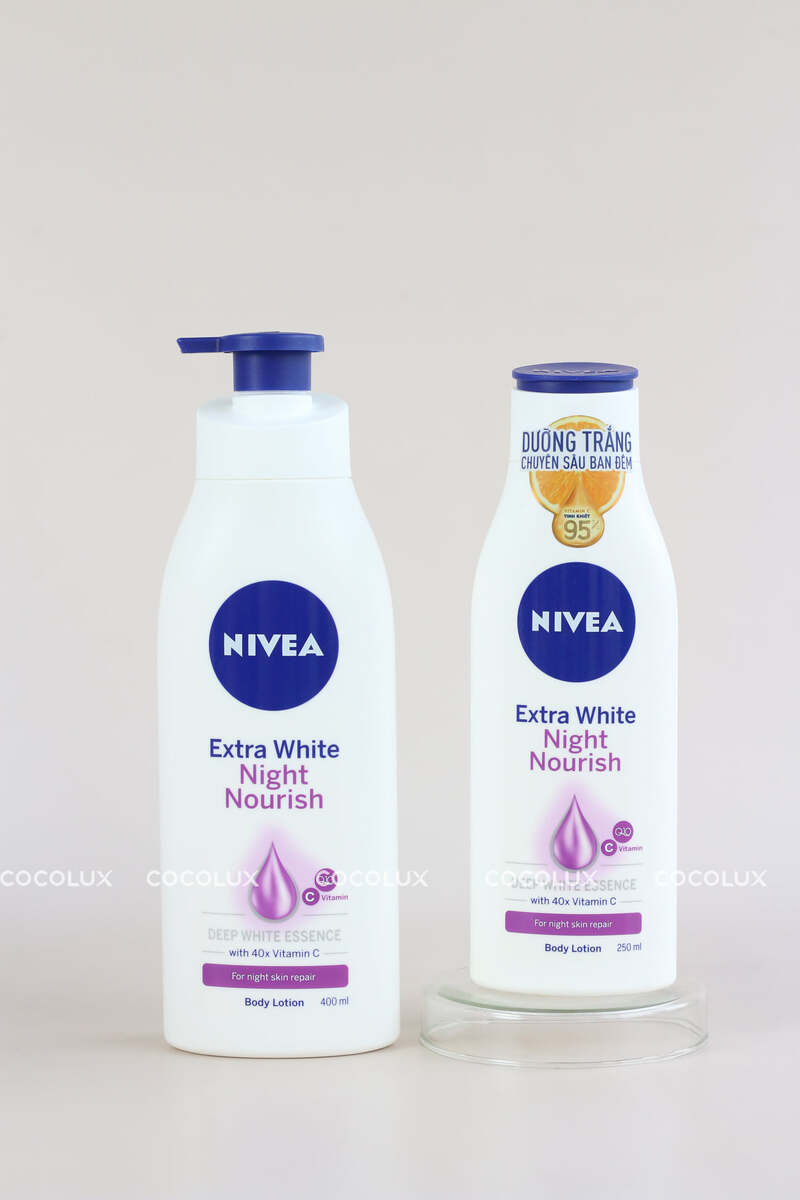 Sữa dưỡng thể Nivea dưỡng trắng chuyên sâu ban đêm là sản phẩm chuyên biệt dùng để dưỡng thể ban đêm. Với công thức đặc biệt, là sự kết hợp hoàn hảo giữa tinh chất dưỡng chất Deep White Essense kết hợp cùng chiết xuất quả Camu Camu (hàm lượng vitamin C cao cấp 40 lần) nuôi dưỡng da và giúp da phục hồi hư tổn, luôn mịn màng, trắng mịn và bảo vệ da khỏi những tác hại từ ánh nắng mặt trời.