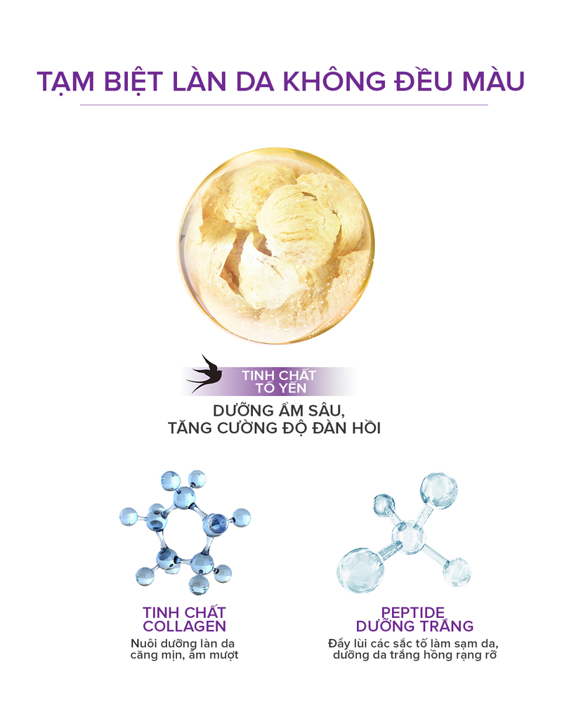 - Swiftlet Nest Extract: Chiết xuất tổ yến giúp ức chế tế bào melanin, kích thích sản sinh collagen và elastin trên da, giảm tình trạng thâm mụn, nám, tàn nhang, chống lão hóa, dưỡng ẩm cho da, thúc đẩy quá trình tái tạo tế bào, kháng khuẩn, kháng viêm, làm dịu, đẩy nhanh quá trình làm lành vết thương.