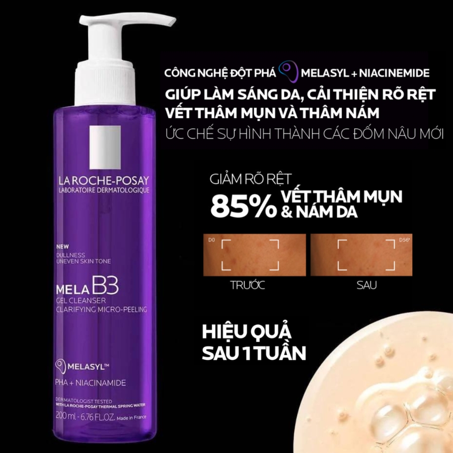 Mela B3 Clarifying Micro-Peeling Gel là một sản phẩm đột phá trong việc chăm sóc da, kết hợp khả năng làm sạch sâu và tẩy tế bào chết dịu nhẹ để mang lại làn da láng mịn chỉ sau lần sử dụng đầu tiên. Sản phẩm này được phát triển bởi La Roche-Posay, một thương hiệu dược mỹ phẩm nổi tiếng từ Pháp, với công thức chuyên biệt chứa các thành phần nổi bật như Melasyl™ và Niacinamide. Được thiết kế để cải thiện tình trạng thâm nám và thâm mụn, gel tẩy tế bào chết này không chỉ làm sáng da mà còn giúp da duy trì sự mềm mại và đều màu.
