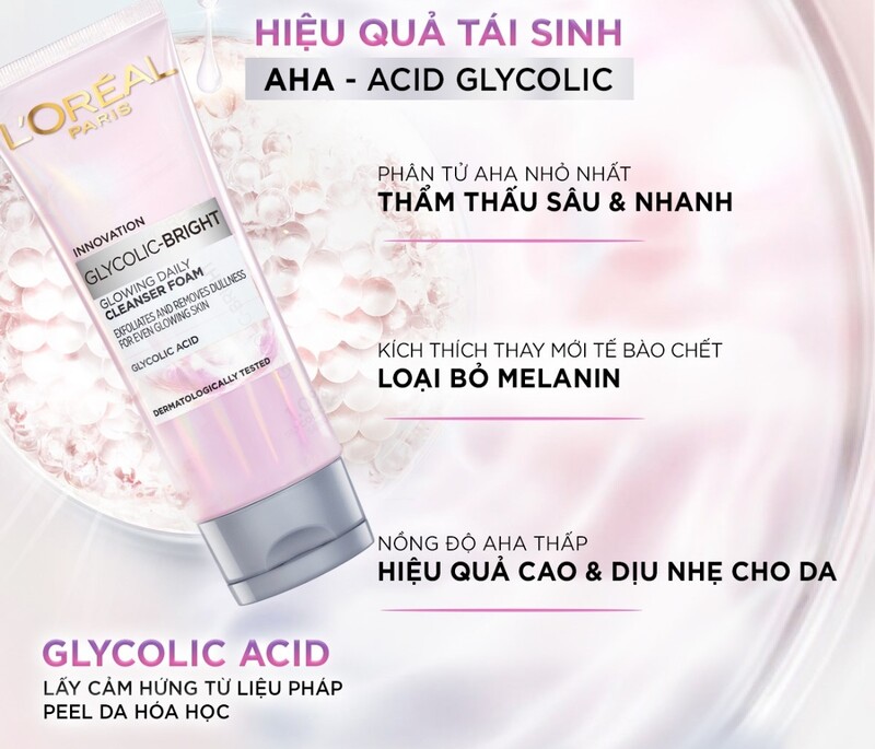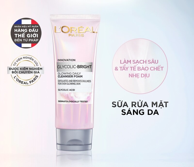 Sữa Rửa Mặt L'Oreal Paris Glycolic Bright Sáng Da 100ml với sự nâng cấp thành phần Glycolic Acid (AHA)++, 2%BHA, 1% vitamin C, Glycerin… đã tạo nên công thức tuyệt vời giúp tẩy tế bào chết, dưỡng da từ bên trong cho da săn chắc, trắng sáng mờ thâm chỉ sau 1 thời gian sử dụng. Sản phẩm được khuyên dùng với mọi loại da, đặc biệt là da thiếu sức sống, da không đều màu.