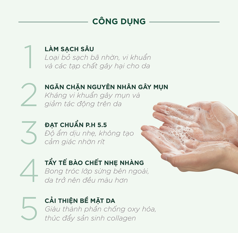 Tạo bọt mịn: Kem dễ dàng tạo bọt bông mịn, độ pH chuẩn 5.5 an toàn và cung cấp độ ẩm dịu nhẹ cho da.
