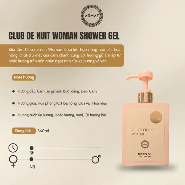 Lấy cảm hứng từ phiên bản nước hoa cùng tên, Sữa Tắm Armaf Club De Nuit Woman 360ml nổi bật với nhóm hương hoa cỏ, nhờ sự kết hợp của hương hoa hồng, hoa nhài và vải, đem đến hương thơm ngọt ngào, quyến rũ.
