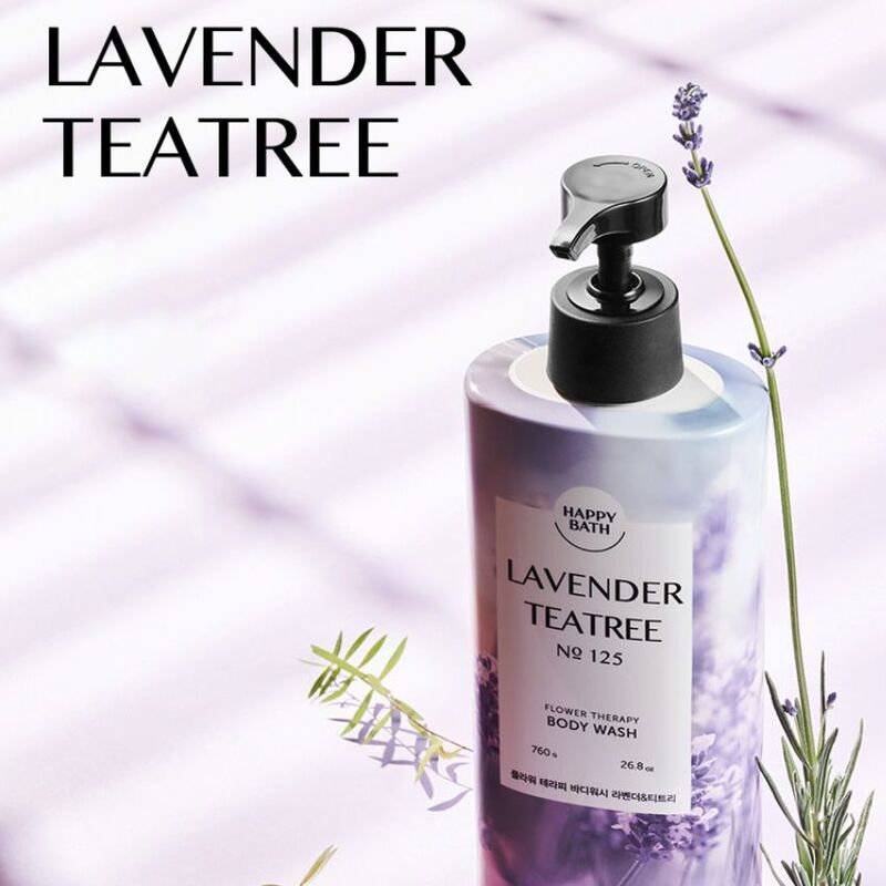 Sữa Tắm Happy Bath Lavender Teatree 760g - Lavender: Kết hợp hương thơm dịu nhẹ của hoa oải hương và tinh dầu tràm trà, mang lại cảm giác thư giãn sâu và giúp làm sạch làn da hiệu quả.