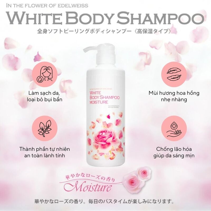 Sữa tắm trắng Manis White Body Shampoo Moisture 450ml là sản phẩm đến từ thương hiệu mỹ phẩm làm đẹp và chăm sóc da nổi tiếng của Nhật Bản Manis. Sản phẩm là dòng sữa tắm cao cấp có chứa các thành phần giàu dưỡng chất, an toàn cho da như collagen, hoa nhung tuyết hyaluronic acid, arbutin, AHA,… Sữa tắm mang mùi hương nhẹ dịu từ hoa hồng, cho bạn hương thơm quyến rũ, nồng nàn suốt cả ngày dài.