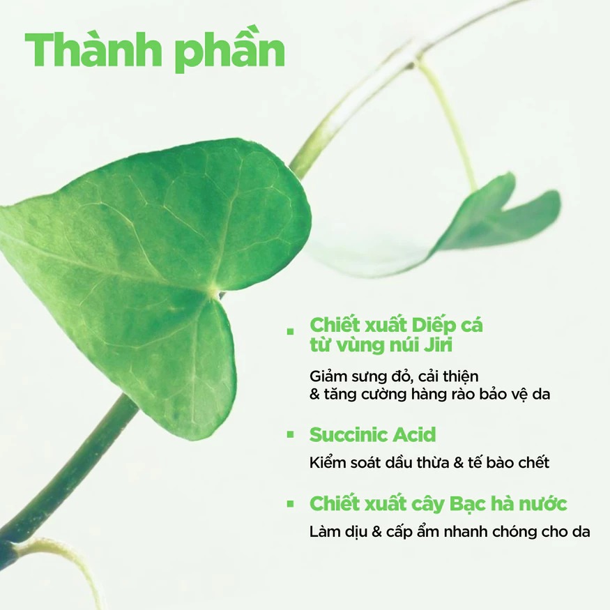 - 80.59% Chiết xuất Cây Diếp Cá: Làm dịu da bị kích ứng (tính chống viêm) và giảm sưng đỏ. Cải thiện cấu trúc da và tăng cường độ ẩm.