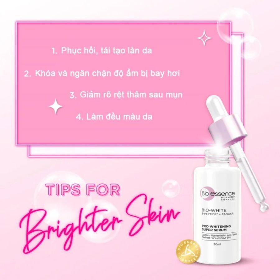 Điểm nổi bật của sản phẩm nhà Bio-essence đó là thành phần Bio-Energy Complex (BEC) - thành phần độc quyền của hãng có khả năng tăng cường phục hồi làn da, kích thích tế bào phát triển và tái tạo làn da tươi sáng, săn chắc hơn. Cùng với đó là hàng loạt các thành phần như 9 loại peptide, Alpha - arbutin… chứa trong màng siêu nhỏ giúp làm sáng da, hỗ trợ cải thiện đốm nâu, ngăn ngừa lão hoá và dưỡng da trắng sáng từ bên trong.