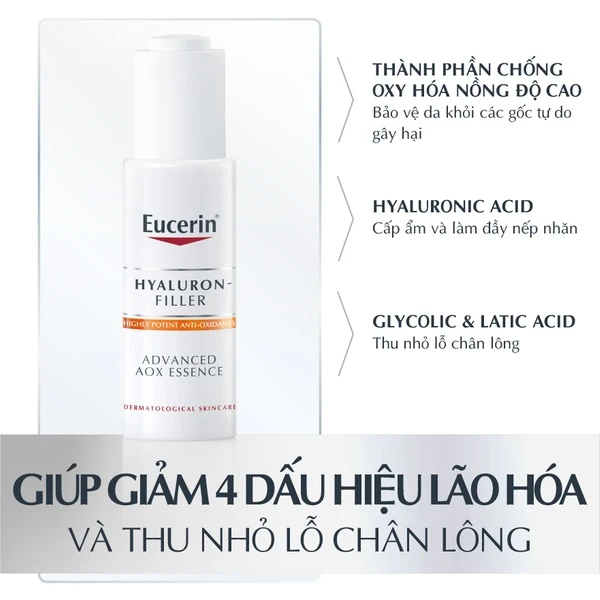 Tinh chất cấp ẩm giảm lão hóa Eucerin Hyaluron Filler Advanced AOX Essence 30ml là một tronh những dòng serum chống lão hoá đình đám nhận được cơn mưa lời khen từ người tiêu dùng. Sản phẩm chứa hoạt chất chống oxy hóa có nồng độ cao giúp trung hòa các gốc tự do gây hại. Bên cạnh đó Tinh Chất Cấp Ẩm Giảm Lão Hóa Eucerin Hyaluron Filler Advanced AOX Essence 30ml còn sở hữu hoạt chất HA giúp cấp ẩm và giữ ẩm cho da, giúp làn da trở nên mịn màng, trẻ trung. Ngoài ra sản phẩm còn kết hợp những thành phần khác làm giảm 4 dấu hiệu lão hóa và thu nhỏ lỗ chân lông, làm trẻ hóa da.