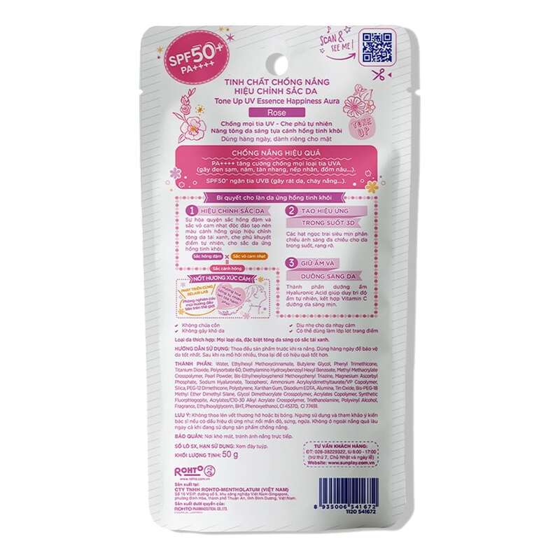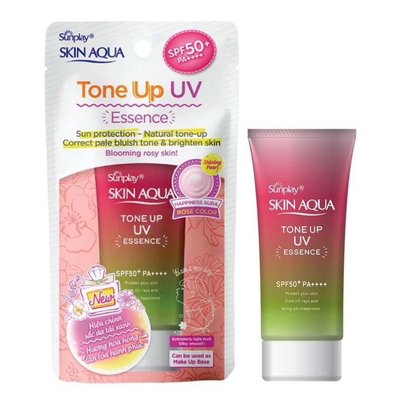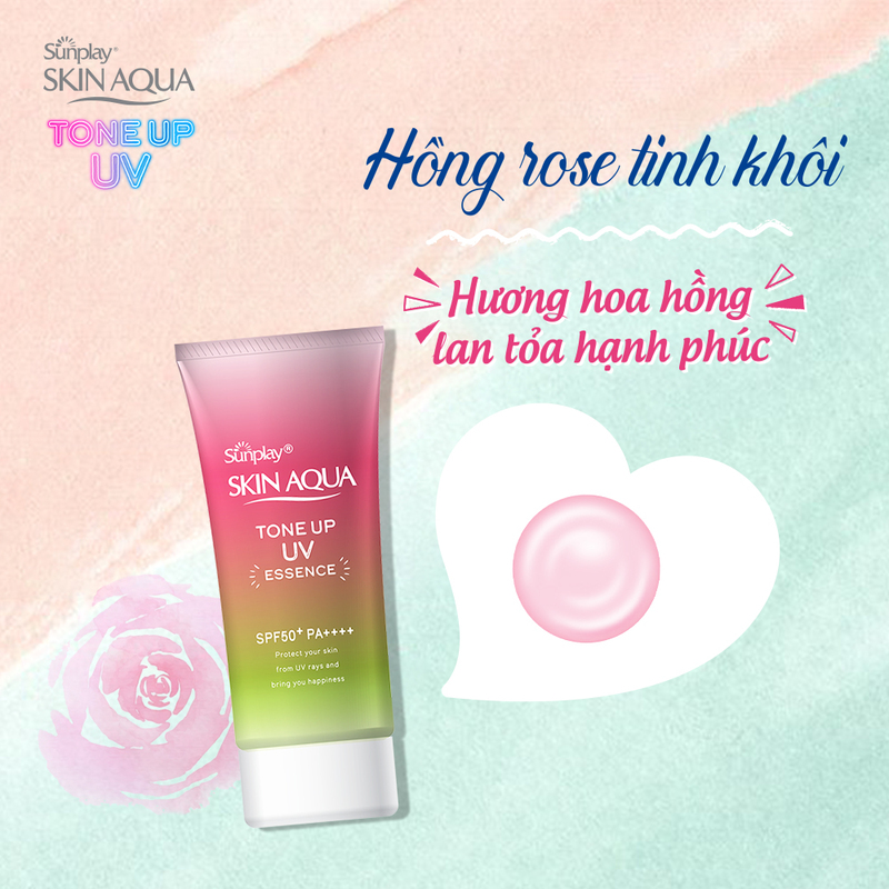 Sản phẩm còn có công dụng giúp hiệu chỉnh sắc da tái xanh, che phủ khuyết điểm nhờ vào việc hòa quyện từ sắc hồng đậm và sắc vỏ cam nhạt cho ra sắc cánh hồng. Vì vậy, Sunplay Skin Aqua Tone Up UV Essence Happiness Aura Rose Color SPF50+ PA++++ 50g còn có thể sử dụng như một lớp lót trang điểm.