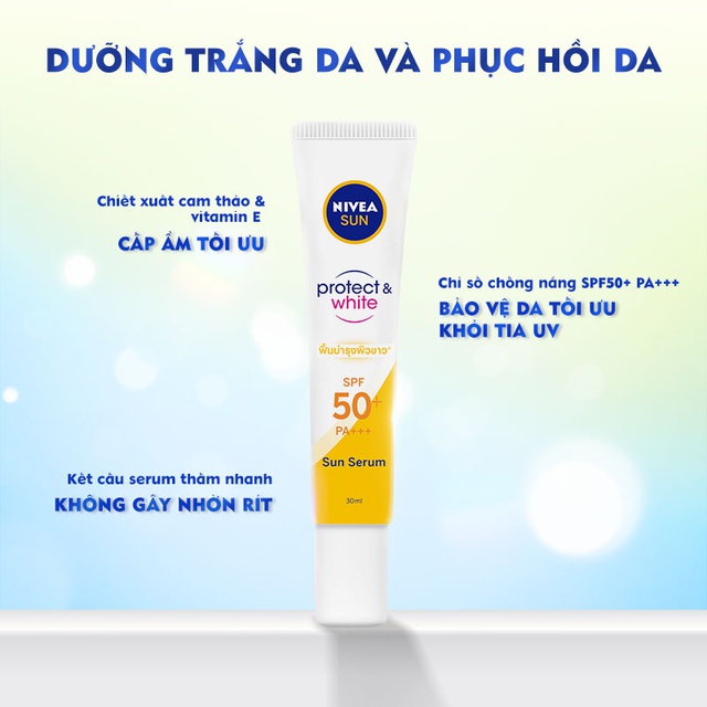 Tinh chất chống nắng và dưỡng trắng Nivea SFP50+ PA+++ 30ml có màng lọc tia UVA và UVB độc đáo, với chỉ số chống nắng cao, lên đến SFP50+ PA+++ , giúp bảo vệ da mạnh mẽ trước tác động của các tia UV từ ánh nắng mặt trời. Sản phẩm giàu Vitamin E và chiết xuất cây Cam thảo, giúp làm sáng da, cung cấp độ ẩm cần thiết cho da, đồng thời, tạo lớp hàng rào khóa ẩm, hạn chế tình trạng mất nước trên da. Serum chống nắng Nivea sử dụng hệ dưỡng ẩm Hydra IQ tiên tiến, giúp tái tạo và phục hồi làn bị tổn thương, làm trắng, dưỡng ẩm tối ưu cho da.