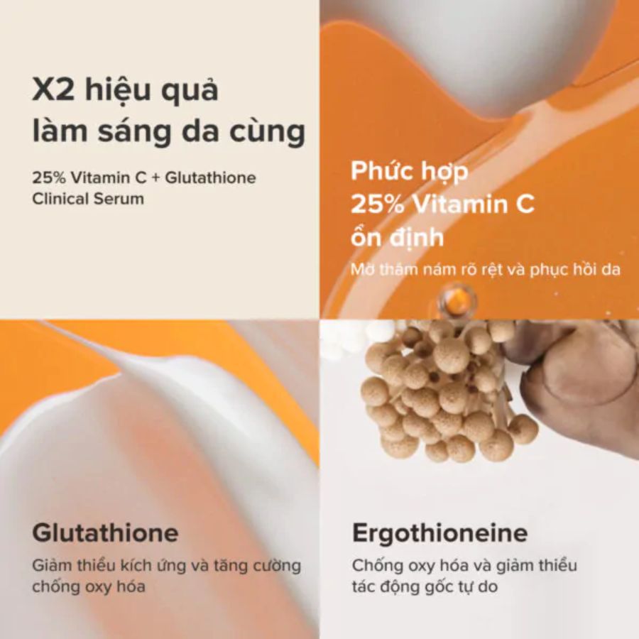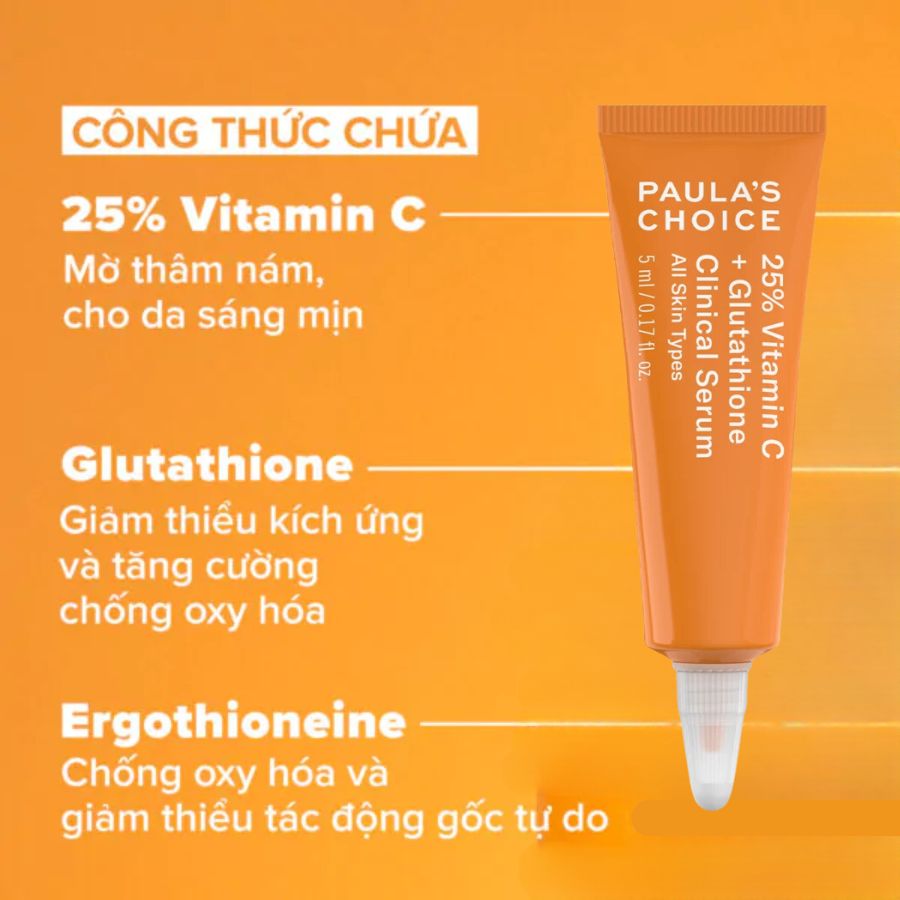 Tinh chất Paula's Choice 25% Vitamin C + Glutathione Clinical Serum là giải pháp tối ưu cho làn da thâm nám, không đều màu. Với công thức chứa 25% Vitamin C ổn định kết hợp cùng Glutathione và công nghệ GAP độc quyền, sản phẩm giúp giảm thâm nám, cải thiện tông da sáng mịn và tăng cường độ đàn hồi, mang lại làn da khỏe mạnh, rạng rỡ.