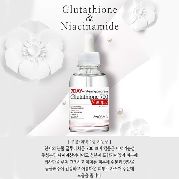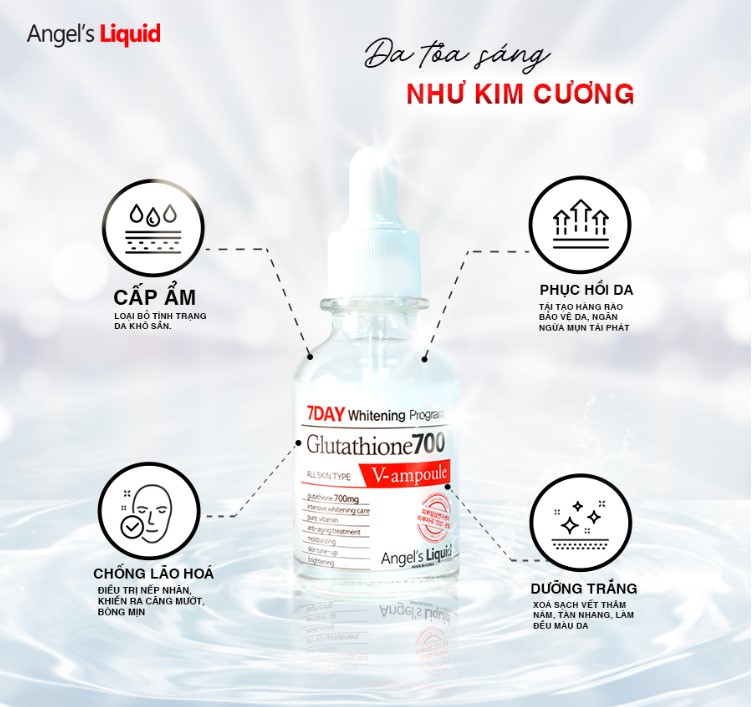 Tinh chất trắng da Angel's Liquid 7Day Whitening Program Glutathione 700 được nhắc đến là sản phẩm đứng đầu trong bộ sưu tập của hãng. Với ưu điểm không cồn, không chất bảo quản, không hương liệu, không thử nghiệm trên động vật và không gây kích ứng cho da. Dùng liên tục tinh chất trong 7 ngày sẽ ngay lập tức mang lại cho bạn làn da mịn màng, tươi sáng, tràn đầy sức sống. Đặc biệt với những dưỡng chất có trong sản phẩm còn giúp nuôi dưỡng da khỏe mạnh, mịn màng, bảo vệ da và làm chậm lão hóa rất hiệu quả.