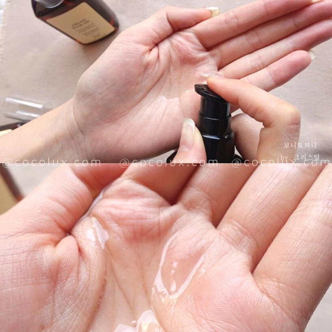 Thiết kế tinh dầu dưỡng tóc cũng khá đơn giản, được làm từ chai nhựa màu nâu, nắp vòi nhấn và bao bì bên ngoài đều có những màu sắc riêng tương ứng với mỗi mùi hương. Kết cấu sản phẩm dạng tinh chất, màu vàng, thẩm thấu nhanh vào tóc và không gây bết dính.