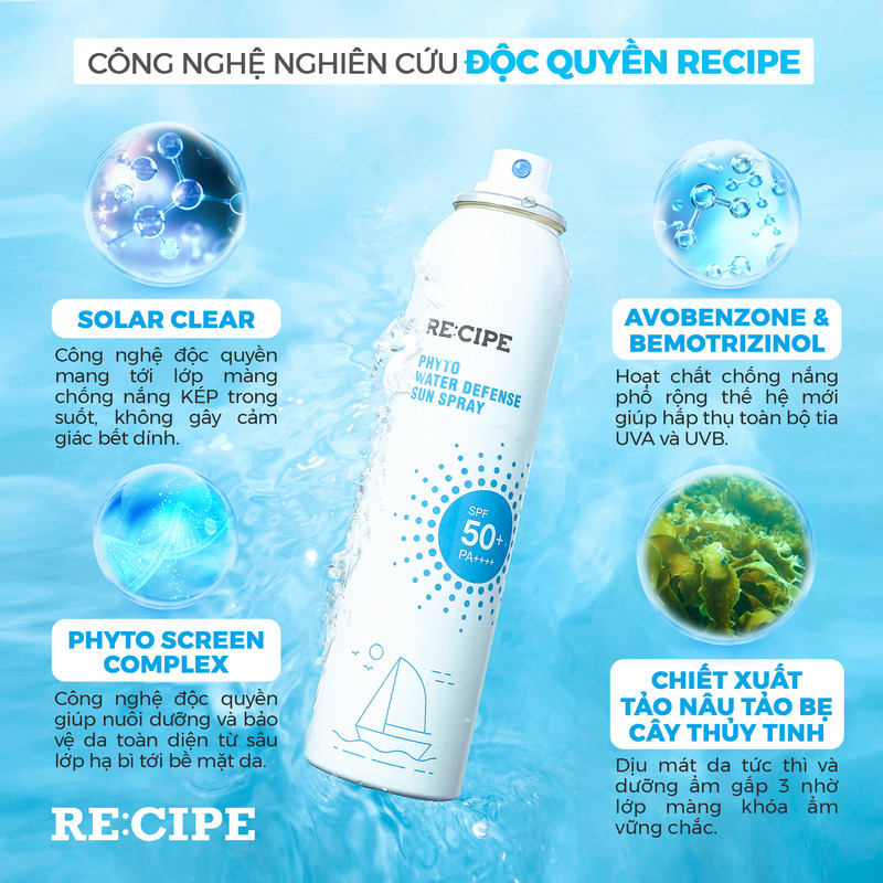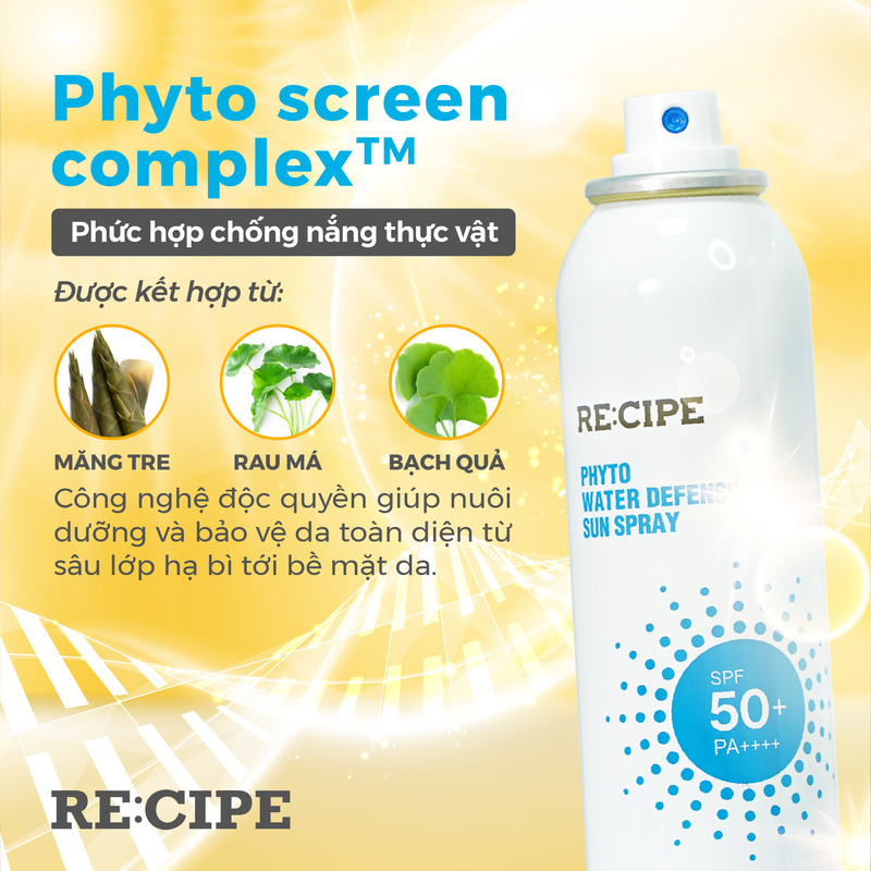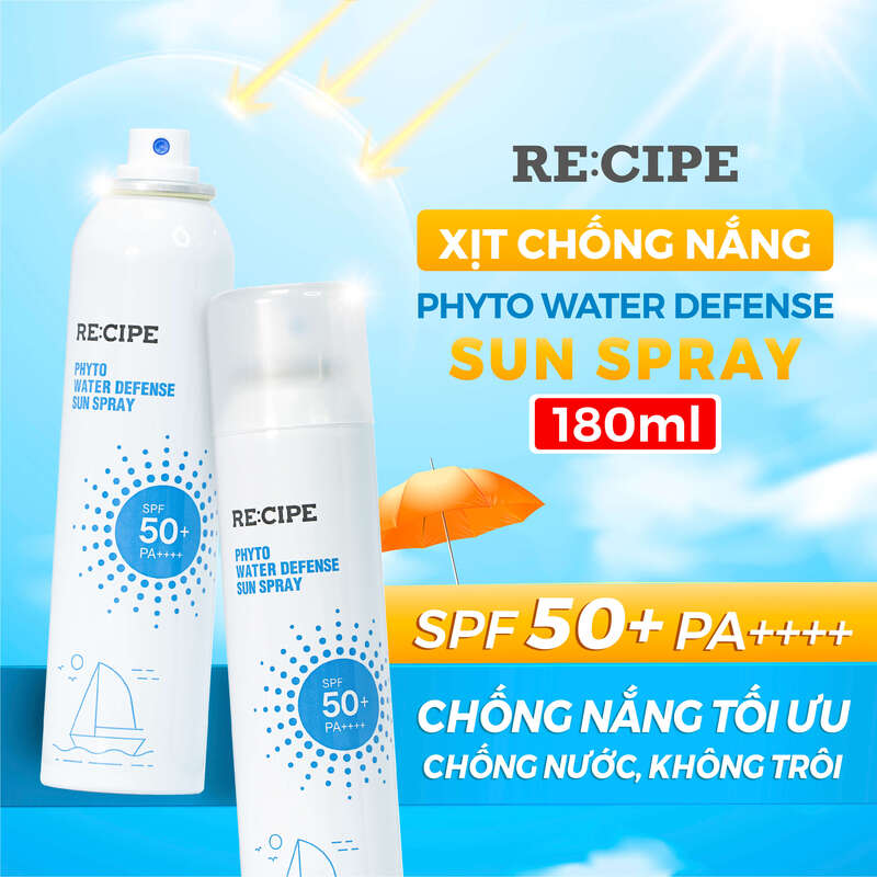 Xịt Chống Nắng Re:cipe Phyto Water Defense Sun Spray SPF50+ PA++++ 180ml là một sản phẩm chăm sóc da chuyên dụng của thương hiệu Re:cipe, được thiết kế đặc biệt để bảo vệ da khỏi tác động của tia tử ngoại (UV) từ ánh sáng mặt trời và có khả năng chống nước, giúp duy trì hiệu quả chống nắng ngay cả hoạt động ngoài trời hay tham gia các hoạt động dưới nước.