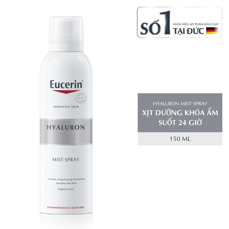 Xịt Dưỡng Ẩm Eucerin Cho Da Nhạy Cảm Hyaluron Mist Spray nổi bật với khả năng hydrat hóa tức thì và lâu dài bên trong da, làm dịu kích ứng cho da khô, dưỡng ẩm và dưỡng da tối ưu. Sản phẩm áp dụng công thức độc đáo 6-Dimension Efficacy Formula, cải thiện được 6 vấn đề của làn da: Tăng cường độ đàn hồi - Phục hồi độ săn chắc - Nâng cơ mặt - Cải thiện sự nhạy cảm - Giảm mệt mỏi cho da - Cung cấp độ ẩm cho da. Thêm vào đó, công nghệ khóa ẩm Lock-in độc quyền chứa Glyceryl Glucoside giúp kích hoạt độ ẩm tự nhiên của da, cho da luôn mướt mịn, săn chắc mà độ ẩm trên da không bị bay hơi.